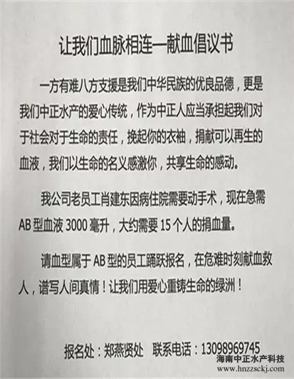 24日,中正小伙伴東哥突發(fā)疾病,急需3000ML AB型血進(jìn)行血漿置換!公司得到消息后,立刻發(fā)布了“讓我們血脈相連—獻(xiàn)血倡議書”,倡導(dǎo)全體中正人積極獻(xiàn)血,幫助小伙伴渡過難關(guān)。