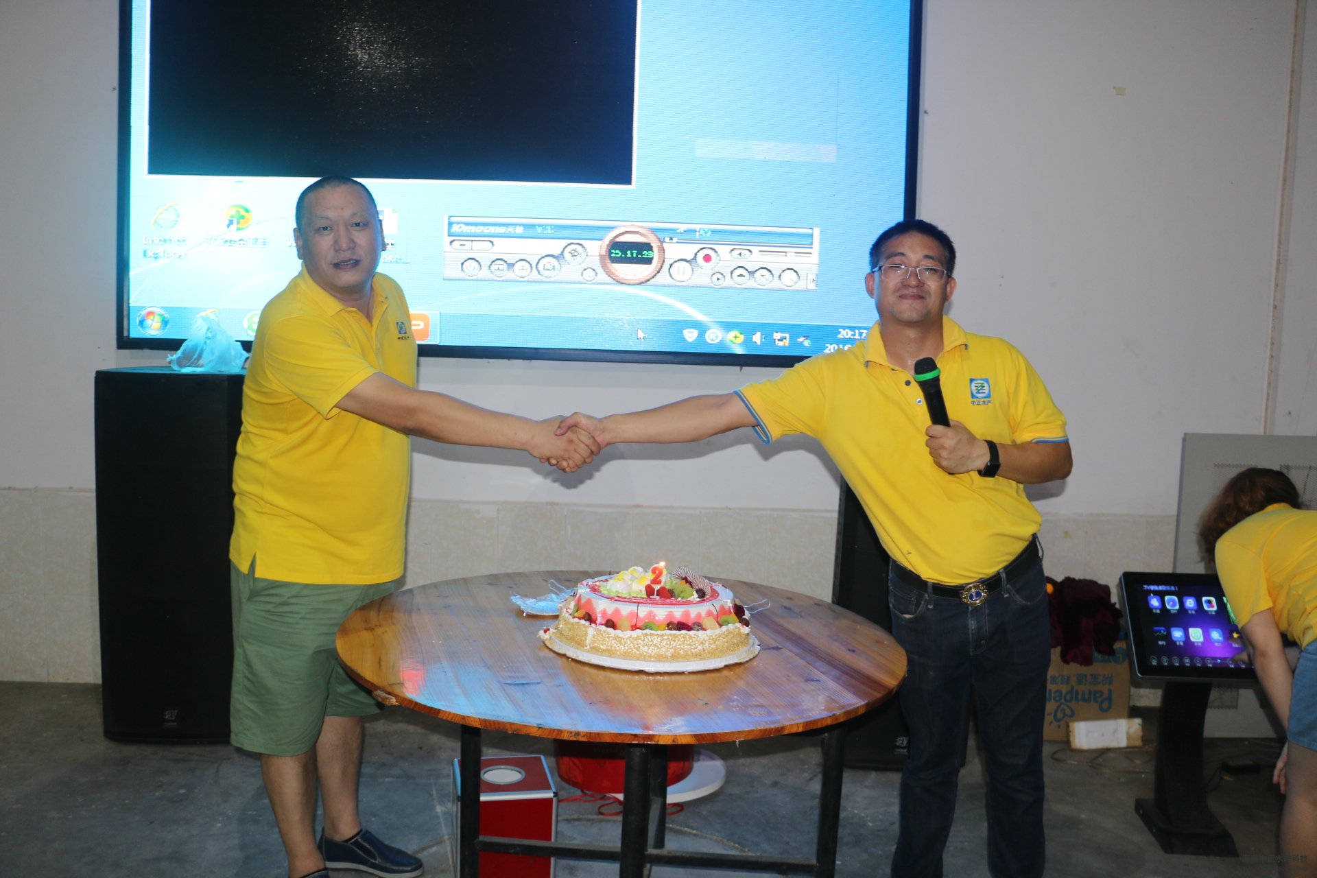 游園活動(dòng)結(jié)束后,公司全體員工共進(jìn)晚餐。為了感謝一直為公司兢兢業(yè)業(yè)、辛勤創(chuàng)業(yè)的兩年老員工,公司給這批老員工獎(jiǎng)勵(lì)了大紅包,激勵(lì)著全體員工向老員工學(xué)習(xí),學(xué)習(xí)老員工辛勤勞動(dòng)、兢兢業(yè)業(yè)、拼搏奉獻(xiàn)的精神。隨后,公司副董事長(zhǎng)雷秋涼和總經(jīng)理王平共切蛋糕,公司全體員工唱生日歌,慶祝中正水產(chǎn)成立兩周年。